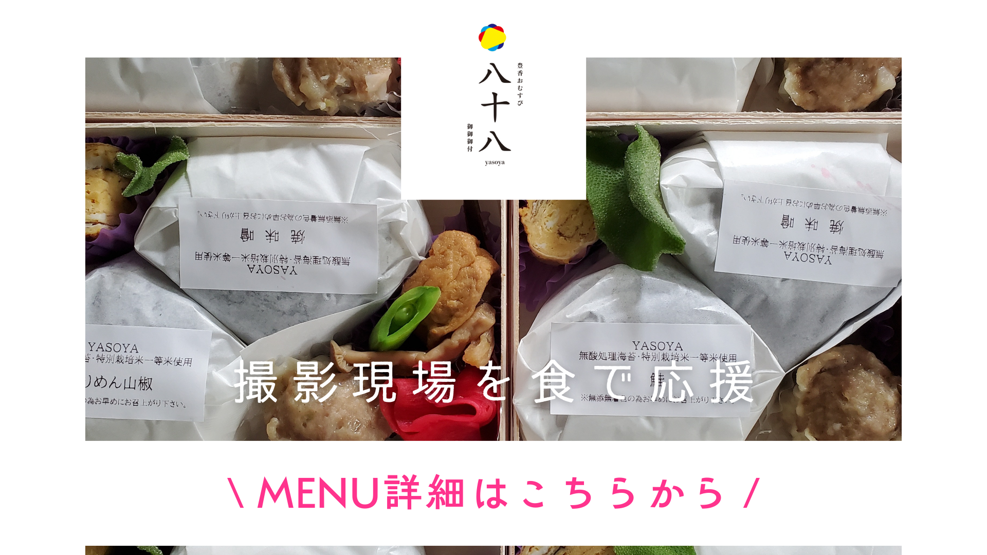 その他 | ■飲食店の運営 ・おむすび 御御御付 八十八-yasoya- ロケ弁のご注文は随時受付対応しております。 ご予算、禁食などのご相談可 ■2020年8月 任意団体 ・八十八ちいき食堂(杉並こども食堂ネットワーク加盟) 2022年6月 認定 特定非営利活動法人 ちいきむすび 代 表 050-3116-0631 ■その他事業 ・レンタルスタジオ(撮影・食事スタイリング等) お気軽にお問合せください。 ■お取引先様 ・株式会社ソニー・ミュージックソリューションズ ・株式会社フジテレビジョン ・テレビ朝日映像株式会社 ・株式会社小学館集英社 ・株式会社光文社 ・株式会社角川春樹事務所 ・太陽企画株式会社 ・株式会社ファインエンターテインメント ・株式会社AOI Pro. ・GENZONE 株式会社 ・株式会社Donuts ・株式会社DOT ONE ・株式会社イエスマン ・株式会社CCCメディアハウス ・株式会社ピラミッドフィルム ・株式会社博報堂 ・株式会社 博報堂Gravity ・株式会社電通クリエイティブピクチャーズ ・株式会社ギークピクチュアズ ・エイベックス・ミュージック・クリエイティヴ株式会社 ・株式会社テレパック ・株式会社Lab.751 TOKYO ・株式会社ヴィジョナリーヴァンガード ・ビービーメディア株式会社 ・株式会社THOUSAND ・株式会社ytv Nextry ・株式会社JーWAVE ・ロックンロール・ジャパン株式会社 ・株式会社オンワード樫山 ・株式会社W ・女子美術大学付属高等学校・中学校/付属 |