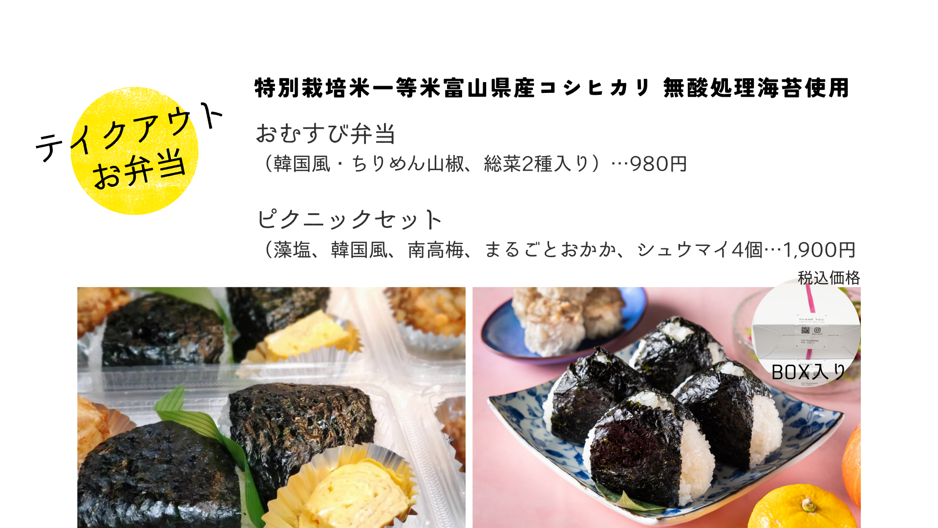 ※価格改定のお知らせ:特別栽培米一等米富山県産コシヒカリ・無酸処理海苔の高騰につき値上げをさせて頂きます。