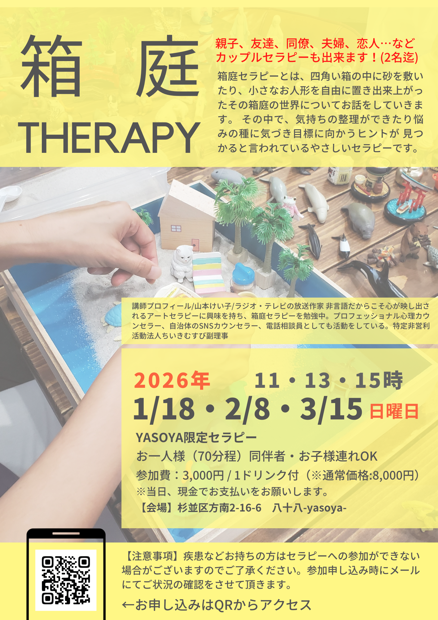 箱庭セラピーとは、四角い箱の中に砂を敷いたり、小さなお人形を自由に置いたりしたあと出来上がったその箱庭の世界についてお話をしていきます。 その中で、気持ちの整理ができたり悩みの種に気づき目標に向かうヒントが 見つかると言われているやさしいセラピーです。